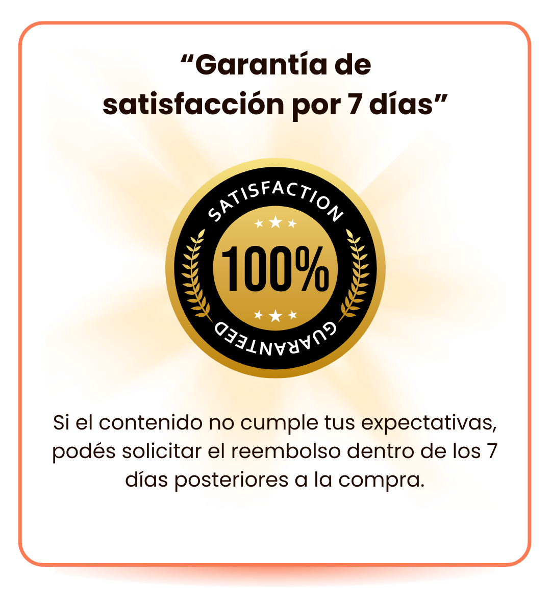 Tenés una garantía de 7 días. Si dentro de ese plazo sentís que el ebook no es para vos, podés solicitar el reembolso y te devolvemos el 100% del dinero. 👉 Sin preguntas. No perdés nada!